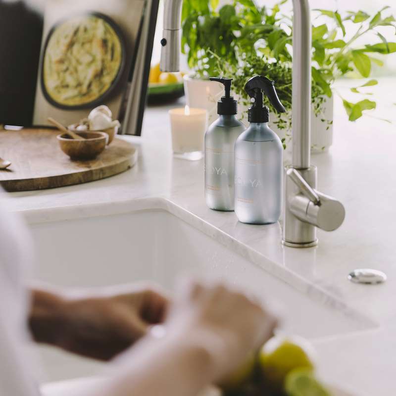 The collection includes fragranced Dish Liquid & 1 Litre Refill, Surface Spray, Hand Wash, Hand Sanitiser and Maisy Kitchen Candle. Great house warming gifts or lovely fragrant cleaning accessories for your kitchen! Lifestyle photos by Ecoya.